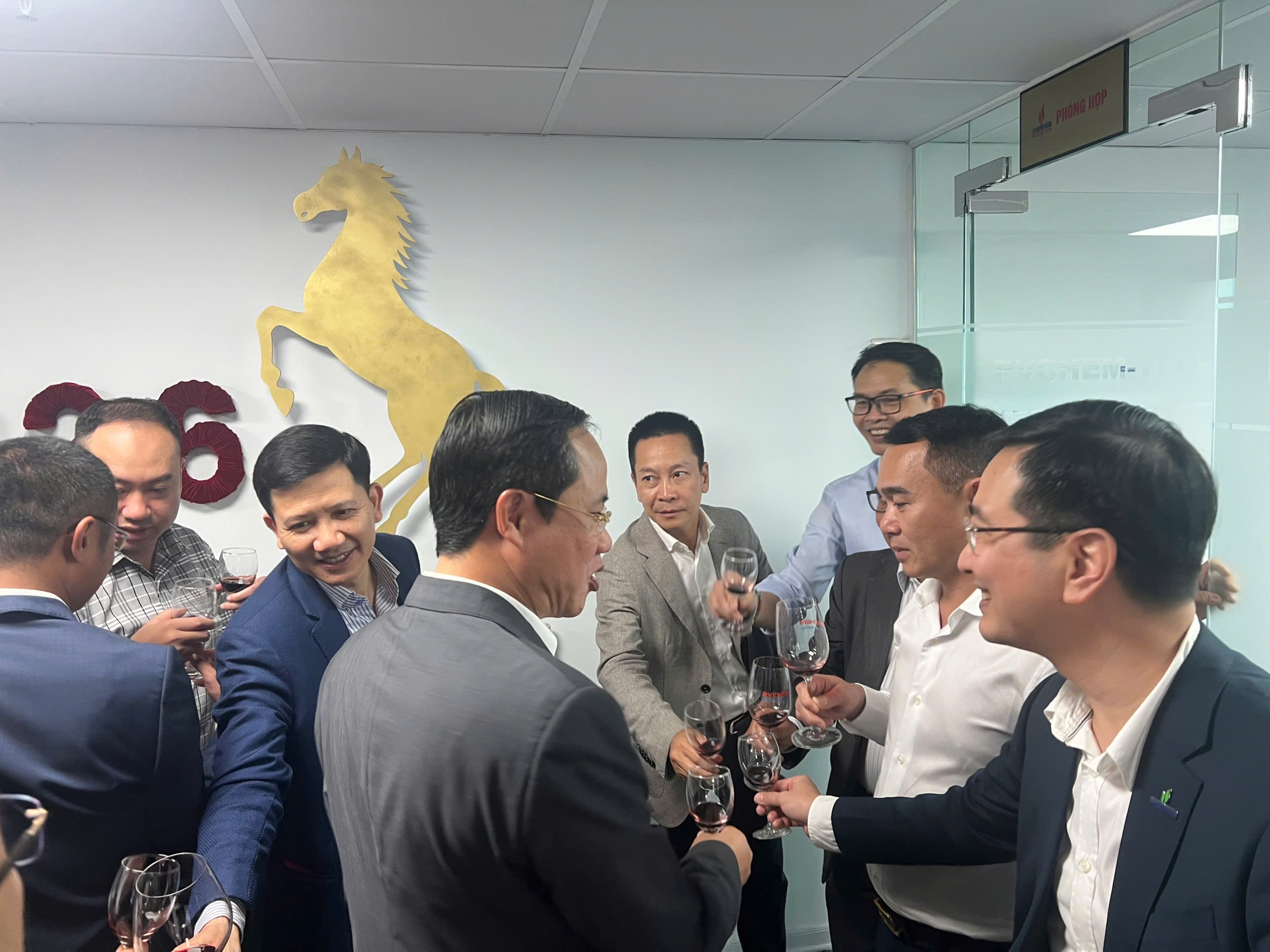Ban Lãnh đạo và tập thể cán bộ, công nhân viên PVChem-Tech nâng ly rượu vang chúc mừng năm mới, thể hiện quyết tâm đồng lòng – vững bước – phát triển trong năm 2026.